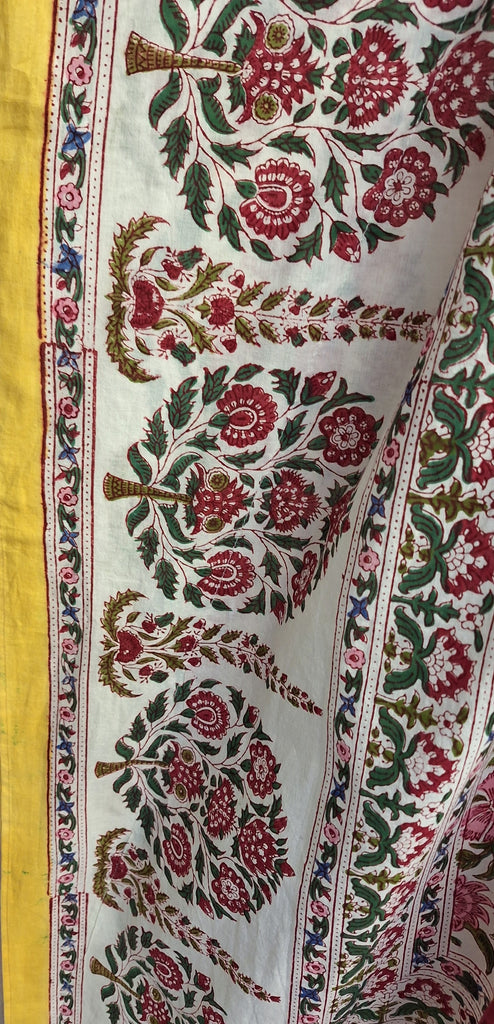 Drawstring across front. Hand block printed in Jaipur, India, using hand carved teak wooden blocks, in traditional designs and colours. Beautiful border prints at edges.