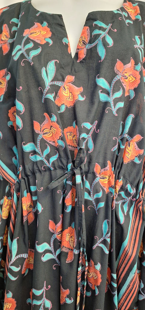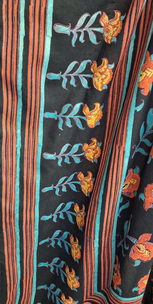 Drawstring across front. Hand block printed in Jaipur, India, using hand carved teak wooden blocks, in traditional designs and colours. Beautiful border prints at edges.