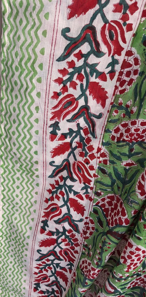 Button up front - drawstring across front. Hand block printed in Jaipur, India, using hand carved teak wooden blocks, in traditional designs and colours. Beautiful border prints at edges.