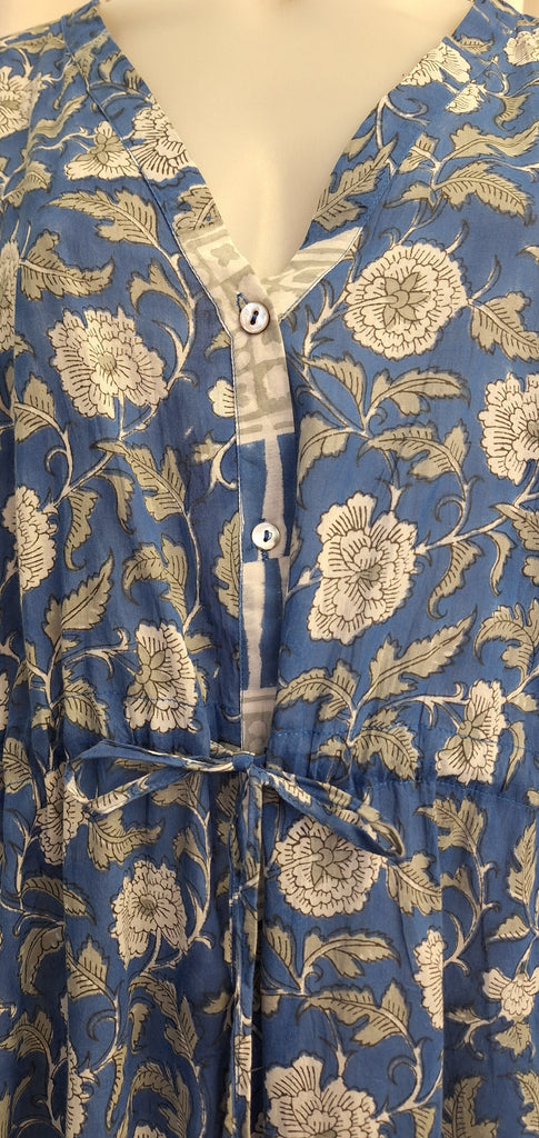 Button up front - drawstring across front. Hand block printed in Jaipur, India, using hand carved teak wooden blocks, in traditional designs and colours. Beautiful border prints at edges.