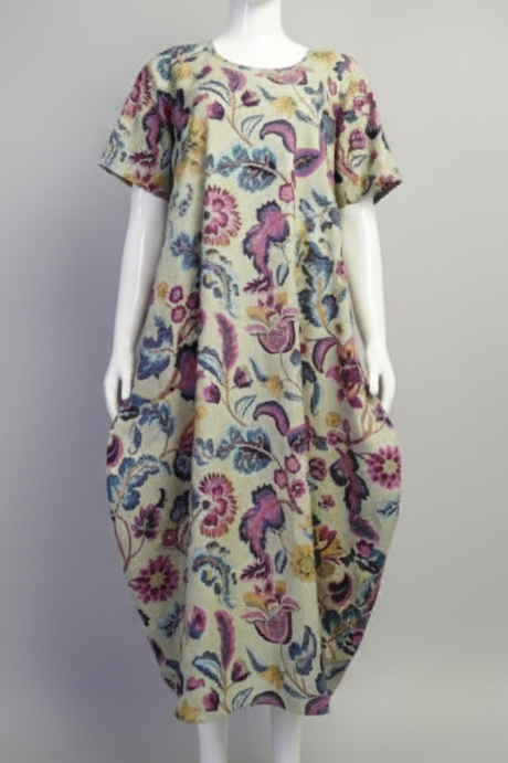 Breeze through warm days in this effortlessly stylish short-sleeve dress, made from 100% pure Indian cotton. The cool, breathable fabric keeps you comfortable all day. The exotic lilac flower print is makes this dress a perfect piece for relaxed holidays, or easy everyday wear.