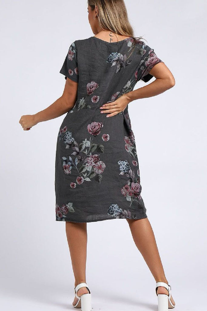 Linen Short Dress with Ribbed Sides Hydrangea - Charcoal