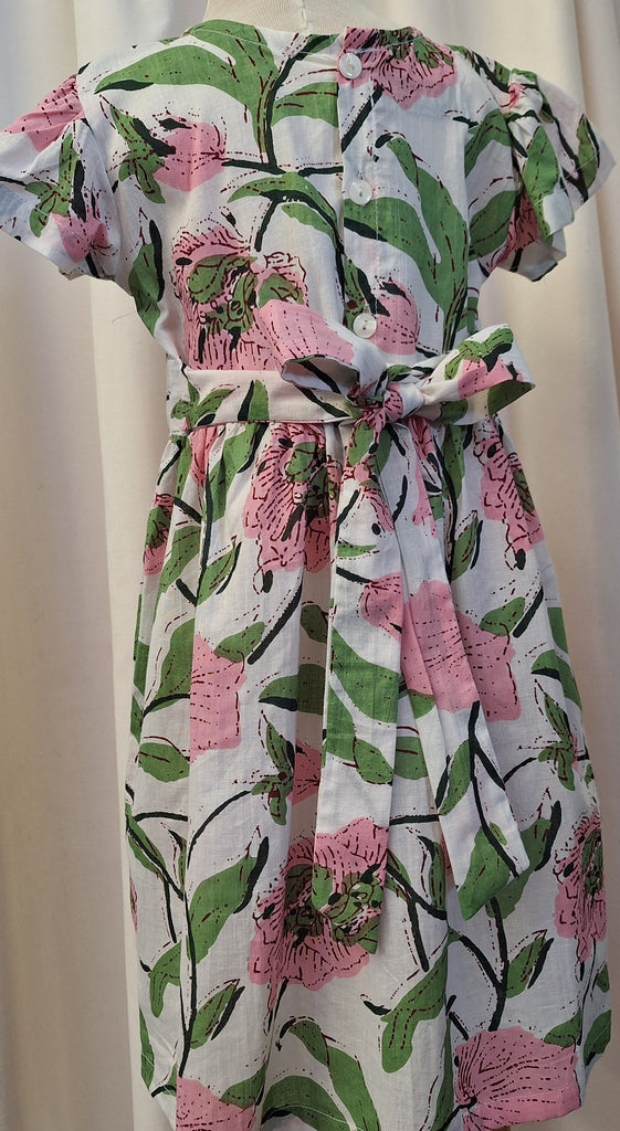 100% cool cotton summer dress with ruffle sleeve. Pretty pink flowers on a white background.