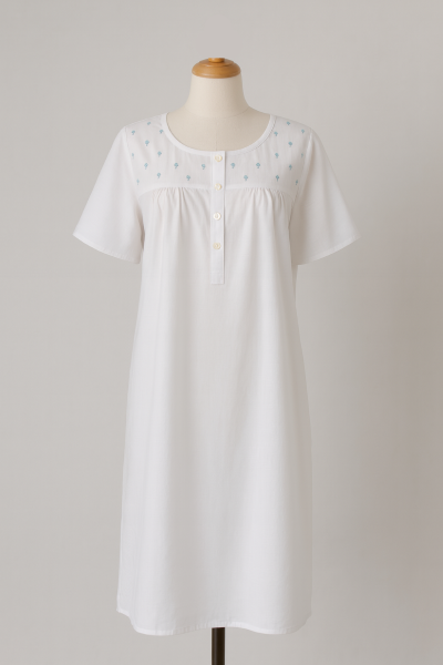 So pretty and soft 100% cotton nightdress with button yoke, and hand embroidered blue flowers. Short sleeves to keep your shoulders warm. Embroidery may differ from photo.