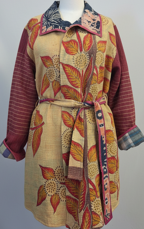 Reversible, lightweight coat in two layers of vintage cotton. On the front is yellow with patterns of red stalks and leaves. See the photos for all the different prints used in this unique coat. Belt up or not. Pockets on the inside and outside.