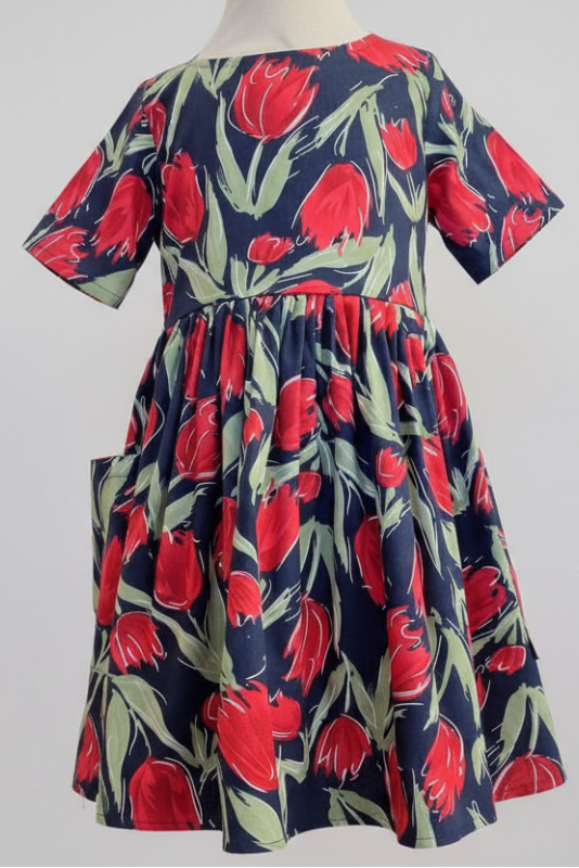 100% cotton, red tulip dress, with sleeves. Big patch pockets at side seams.